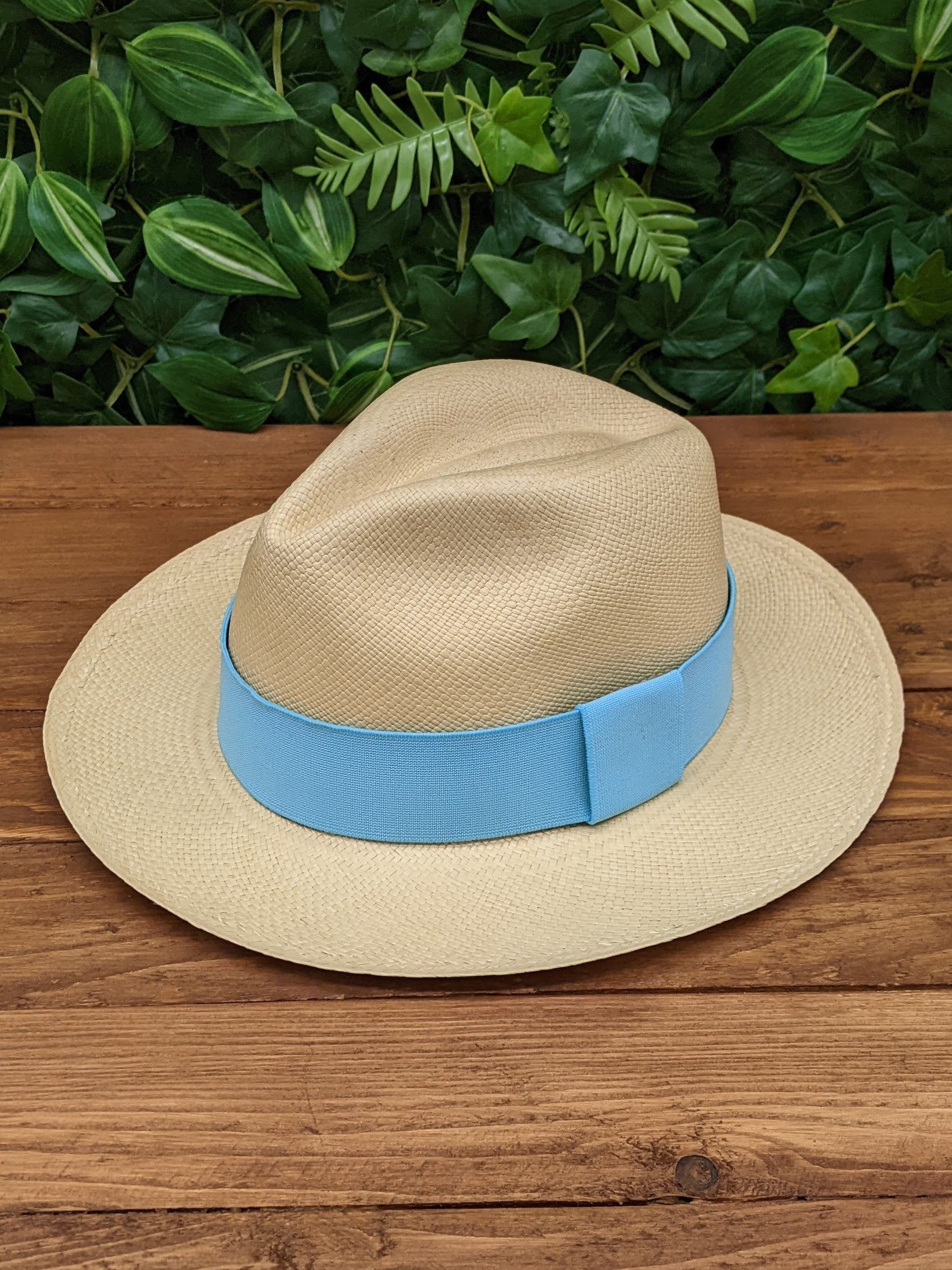 Genuine Panama Hat with removable light blue band - handwoven from Toquilla Palm, sustainably sourced from Ecuador